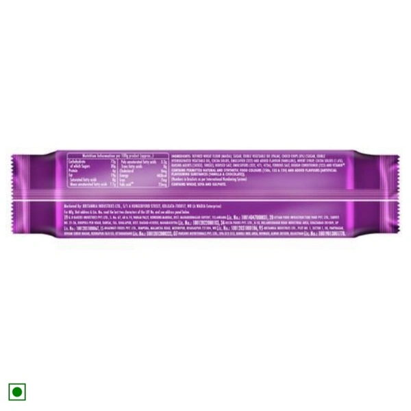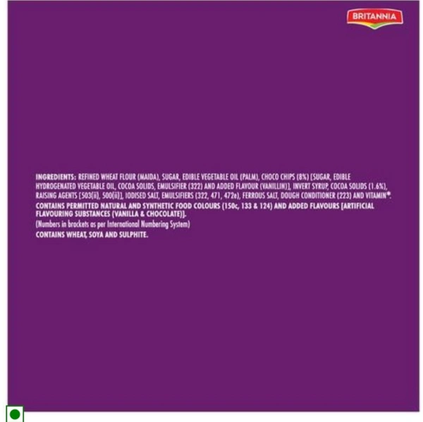 Prepared Using Refined Wheat Flour (Maida), Sugar, Edible Vegetable Oil (Palm), Choco Chips (Sugar, Edible Hydrogenated Vegetable Oil, Cocoa Solids, Emulsifier And Added Flavour (Vanillin), Invert Syrup, Cocoa Solids, Raising Agents, Iodised Salt, Emulsifiers, Ferrous Salt, Dough Conditioner And Vitamin, Artificial Flavouring Substances (Vanilla Chocolate)