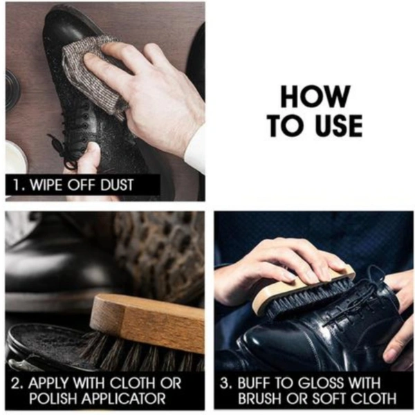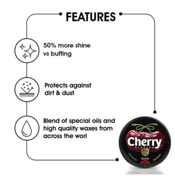 Suitable for black leather shoes Provides protection from dirt and dust Blend of special oils and high quality waxes from across the world Apply polish with a cloth or polish applicator on clean shoes and buff to a gloss with a brush or soft cloth Also available in brown variant and liquid and handyshine format