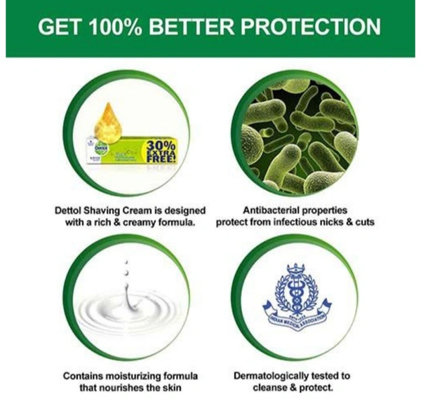 Dettol is one of the world's most trusted antiseptic protection brand which gives you 99.99% protection against disease-causing bacteria and germs. Their shaving cream is ideal for a smooth and fine shave. It gives you 10 times better protection from germs and bacteria as compared to other ordinary shaving products.