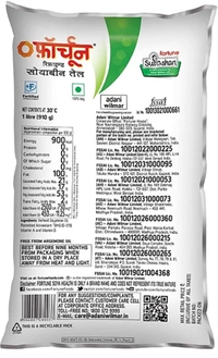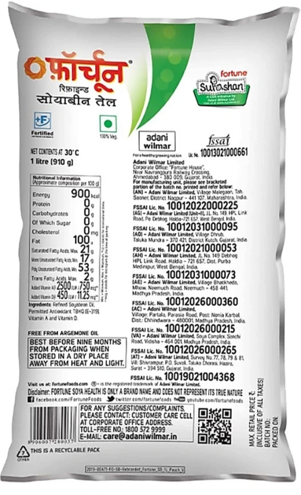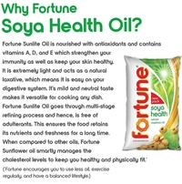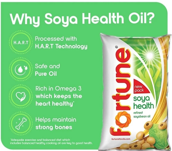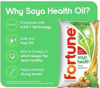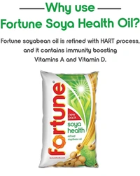 सोया रिफाइंड Fortune Soya Health Oil is processed with next-generation High Absorbent Refining Technology (H.A.R.T). So your everyday meals not only taste better but also make your Bones stronger and your Heart & Eyes healthier. Refined Soyabean Oil, Permitted Antioxidant TBHQ (E-319), Vitamin A & Vitamin D.