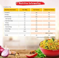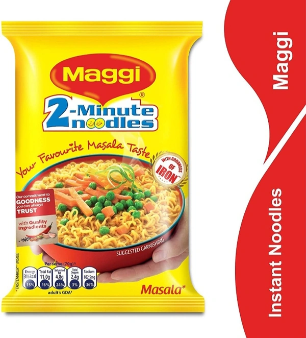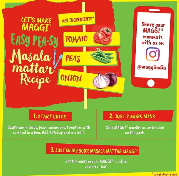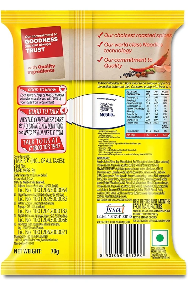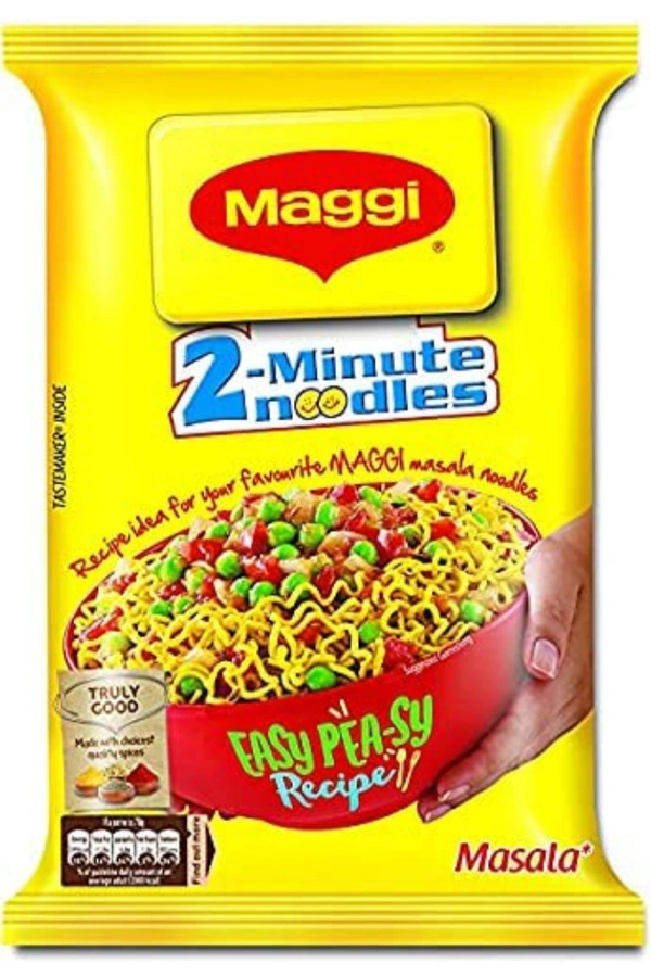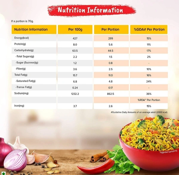 Noodles: Wheat flour, Palm oil, Salt, Wheat gluten, Stabilizer (170(i)), Thickeners (508&412), Acidity regulators (500(i) & 501 (i)) and Humectant (451(i)). MASALA TASTEMAKER: Hydrolysed groundnut (peanut) protein, Mixed spices {(23.6%) of Which (onion powder, Coriander, Chilli powder (12.7%), Turmeric (11.7%), Garlic powder (10.5%), Cumin, Aniseed, Ginger, Fenugreek, Black pepper (1.5%), Clove (0.5%), Nutmeg and Green Cardamon (0.5%))}, Noodle powder (Wheat flour, Palm oil, Salt, Wheat gluten, Stabilizer (170(i)), Thickeners (508&412), Acidity regulators (500(i) & 501 (i)) and Humectant (451(i))), Sugar, Edible starch, salt, Palm oil, Acidity regulators (330&500(ii)), Thickner (508), Colour (150d) and Flavour.