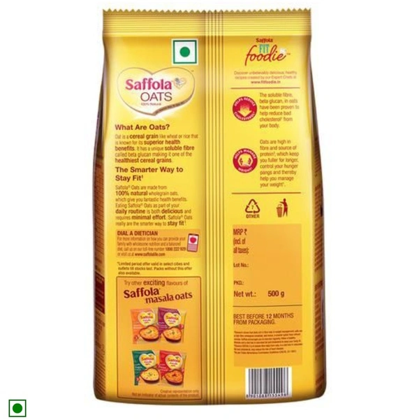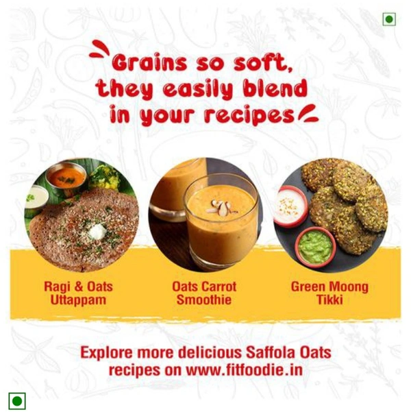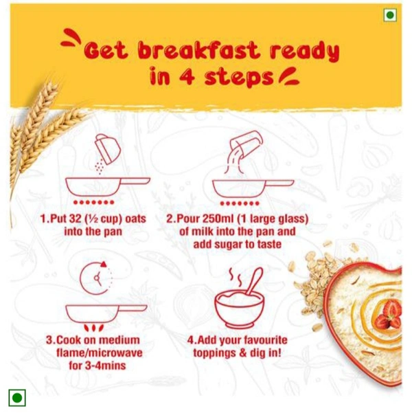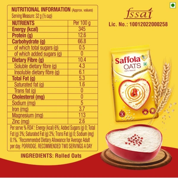 Saffola Oats are made with 100% natural wholegrain rolled oats. Its grains are so soft that it provides a super creamy texture to your breakfast. Porridge prepared by Saffola Oats is so creamy that it melts in your mouth. Relish a quick bowl of Saffola Oats by simply adding your favorite toppings like fruits, honey, syrup etc. Ready in 3 minutes; Saffola Oats can be had as a hot bowl of oats or a yummy cold dessert