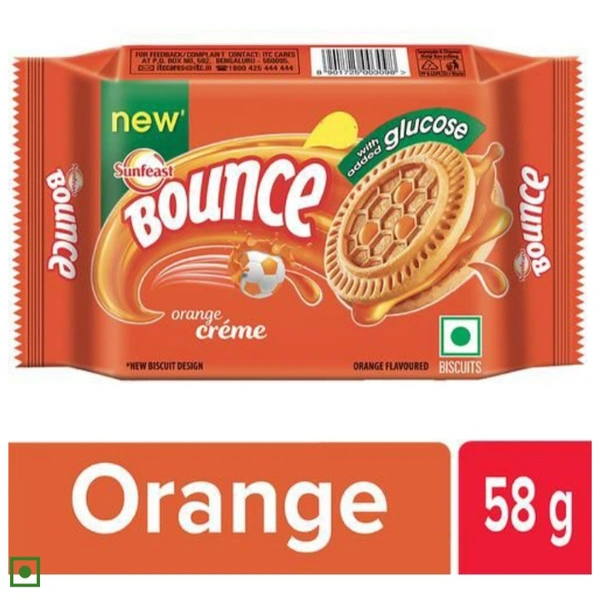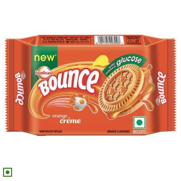Sunfeast Bounce Biscuits - Orange Creme Cookies. Dive into a world of delicious flavours of Sunfeast Bounce with Smooth delicious crème sandwiched between crunchy biscuits. Every single offering in the Bounce range of products has been crafted to make you go wow. Introducing the range of Sunfeast Bounce-Bounce Crème Biscuits, Bounce Dream Crème and Bounce Double Crème – a bite of Bounce will fill you up with joy! Deliciously creamy and deliciously fun! The Sunfeast Bounce biscuits are available in four tasty flavours- Chocolate, Orange, Elaichi and Pineapple. The flavoured biscuit shell with a soft creamy centre takes you to a world of fun and excitement!