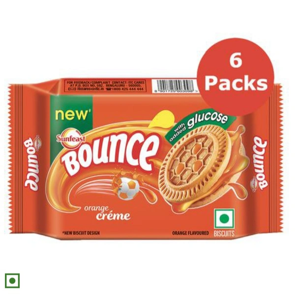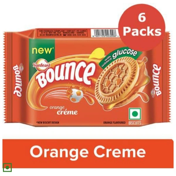 Sunfeast Bounce Biscuits - Orange Creme Cookies. Dive into a world of delicious flavours of Sunfeast Bounce with Smooth delicious crème sandwiched between crunchy biscuits. Every single offering in the Bounce range of products has been crafted to make you go wow. Introducing the range of Sunfeast Bounce-Bounce Crème Biscuits, Bounce Dream Crème and Bounce Double Crème – a bite of Bounce will fill you up with joy! Deliciously creamy and deliciously fun! The Sunfeast Bounce biscuits are available in four tasty flavours- Chocolate, Orange, Elaichi and Pineapple. The flavoured biscuit shell with a soft creamy centre takes you to a world of fun and excitement!